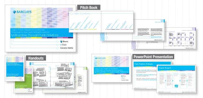 Barclays Global/iShares New Business Proposal and Presentation Elements included coil-bound printed pitch book, leaflet-sized handouts, and a custom-templated powerpoint presentation